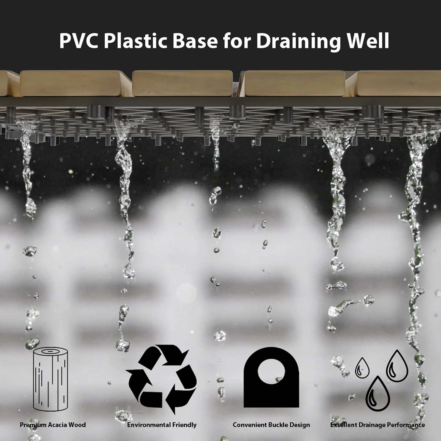 These 10 pcs decking tiles are made of solid acacia wood, which is weather-resistant and highly durable. The PVC plastic base of tiles allows for plenty of drainage to avoid ponding. Thanks to its easy-to-assemble plug-in connection, the tiles can interlock easily and tightly to form the stable walking surface, not easy to slippery. Elegant and natural wood floor tiles features exquisite wood texture, aiming to build a relaxing area for enjoying the serenity and finding peace of mind.