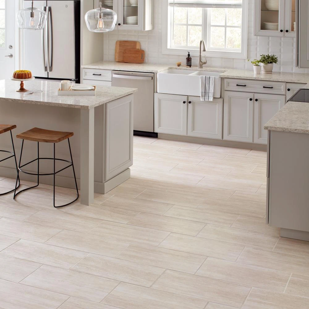 Elevate your space with the Glendale 12 in. x 24 in. Ivory porcelain floor and wall tile by Daltile. This white travertine look tile showcases beautiful veining and has a linear pattern. Use it in kitchens, bathrooms and laundry rooms for a classic look. As beautiful as it is durable, this porcelain tile is waterproof, scratch- resistant, and stain proof.