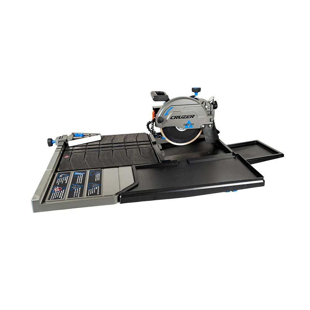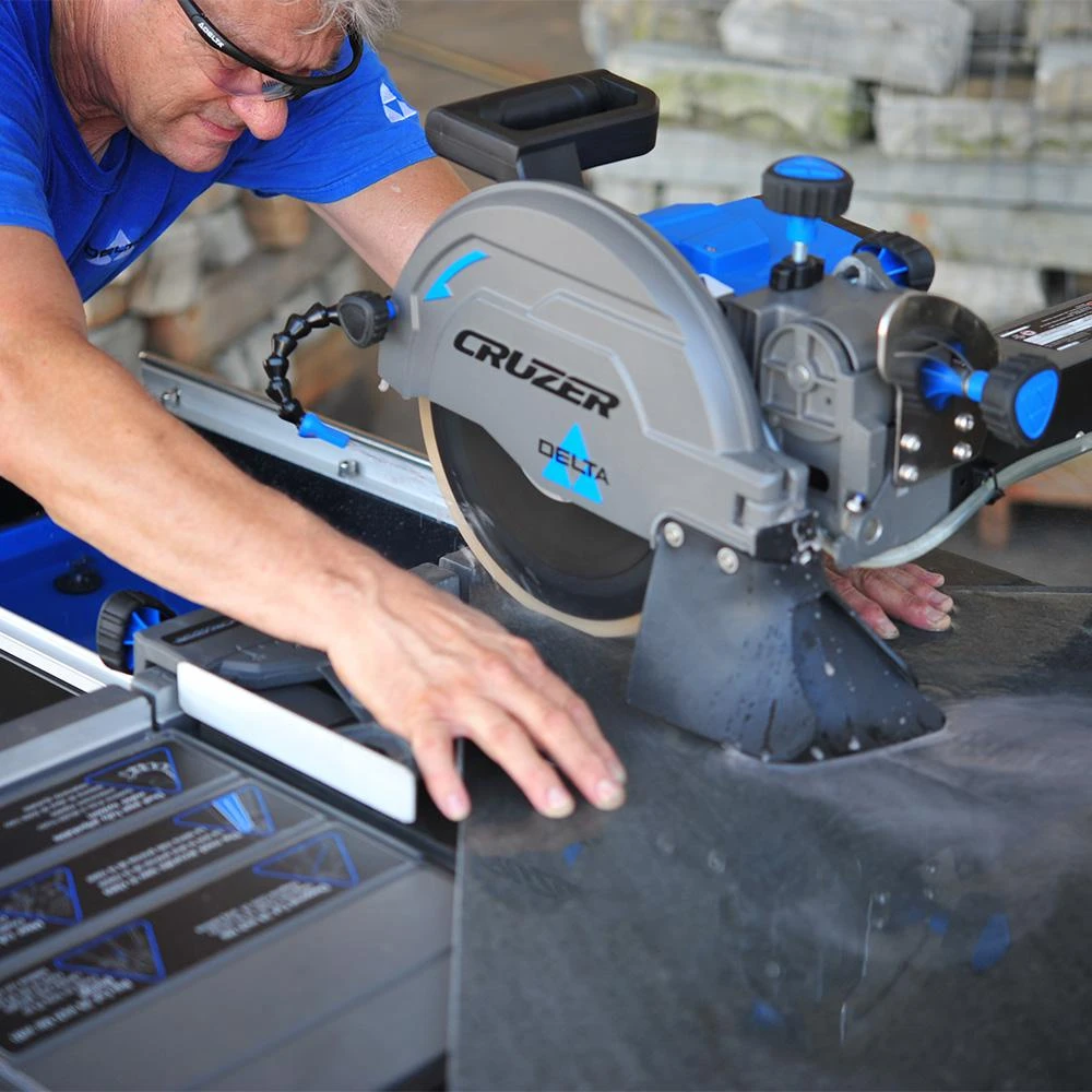 Get powerful, professional results with this Delta 10 in. Wet Tile Saw. Its 15 amp motor cuts through natural and man-made stone, tile and pavers. The diamond cutting wheel handles stone up to 3-3/8 in. thick and delivers a best-in-class rip capacity of 34 in. and an 24 in. diagonal cut capacity. The saw is constructed using a heavy-duty rail system with 12 bearings that’s engineered for smooth, straight and accurate cuts. Adjust the dual water nozzles for optimal water placement on the blade to minimize over-spray and keep the blade cool for superior cutting performance.