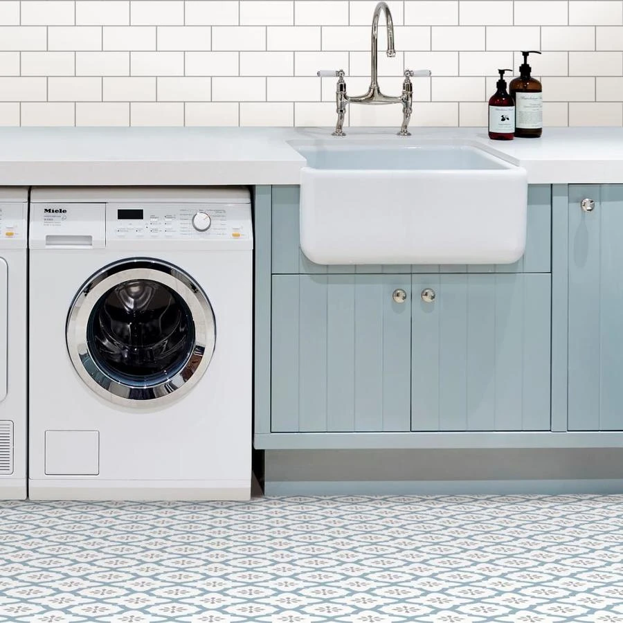 Blue and grey peel and stick floor tile with a Farmhouse style