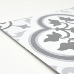 Brighten up kitchen and bathroom floors with these peel and stick virgin vinyl tiles. A grey gothic-style motif effortlessly complements a crisp white background. FloorPops Remy Peel & Stick Floor Tiles contain 10 square pieces on 10 sheets that measure 12 x 12 inches. This product measures 60 inches long, 24 inches wide, and 0.06 inches thick when assembled and weighs 5.5 pounds. FloorPops have a textured low lustre finish and one pack covers 10 square feet.