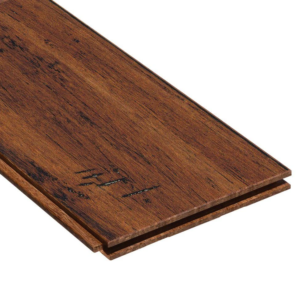 - Prefinished strand woven bamboo spice, medium color, hand scraped finish, FSC certified
