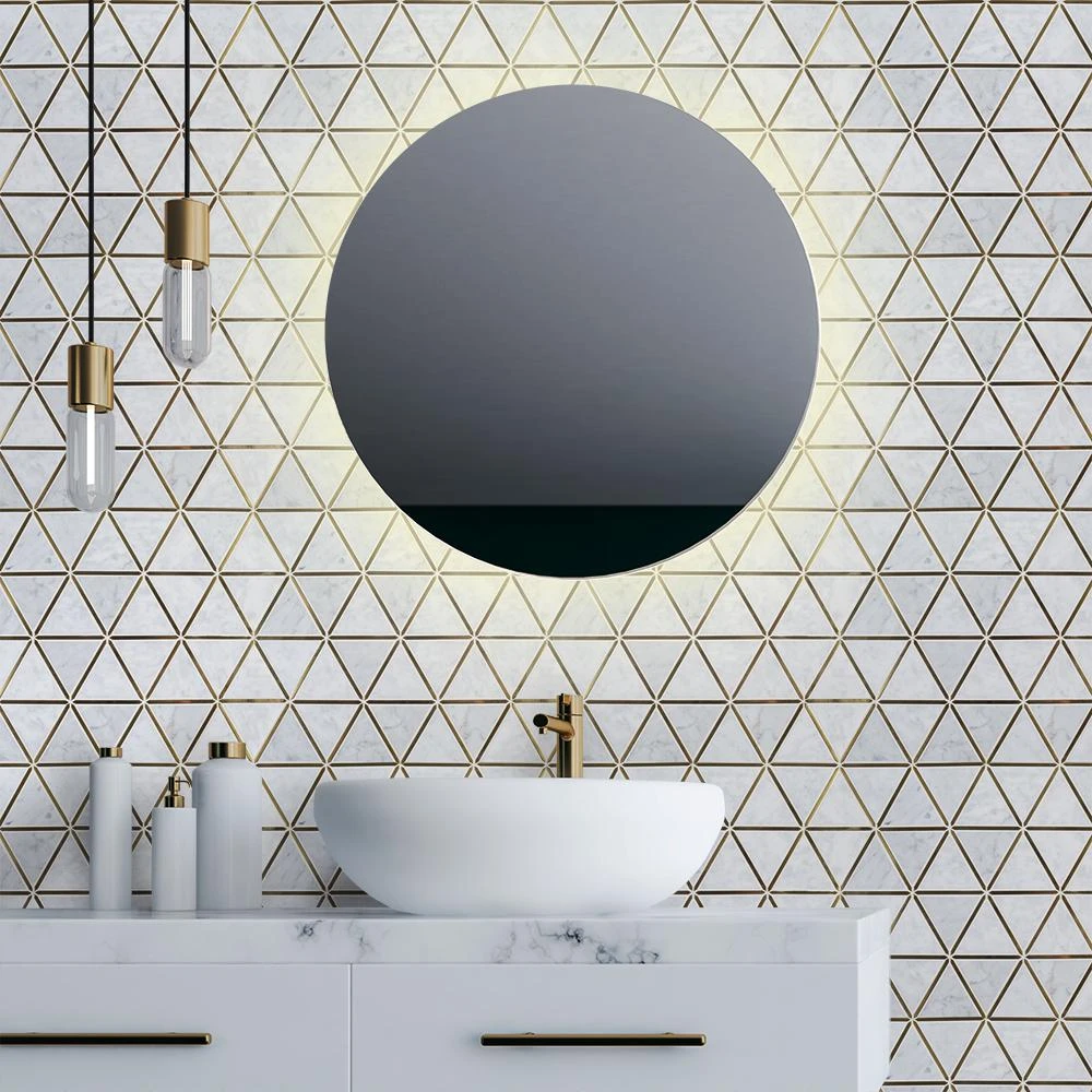 From the Jeff Lewis Tile collection, Larchmont 8-1/2 in. x 14-1/2 in. is a beautifully crafted large format mosaic tile that feature interlocking geometric triangles for a modern and contemporary look. Contained in brushed gold metal accents, grey mineral veins swirl and streak randomly throughout the natural white marble stone for a timeless addition to any home.