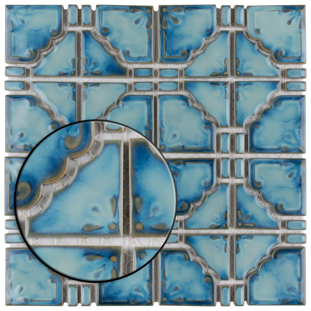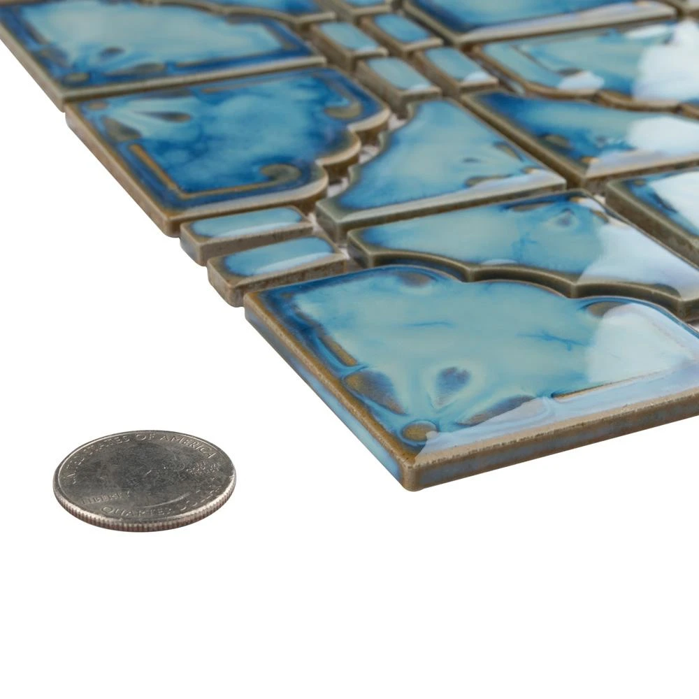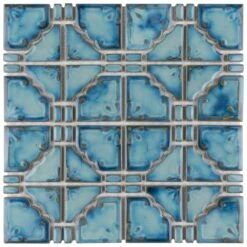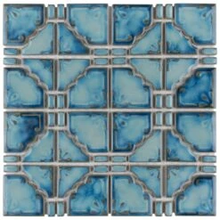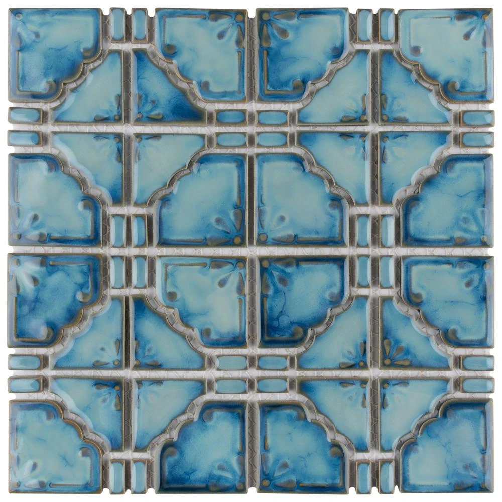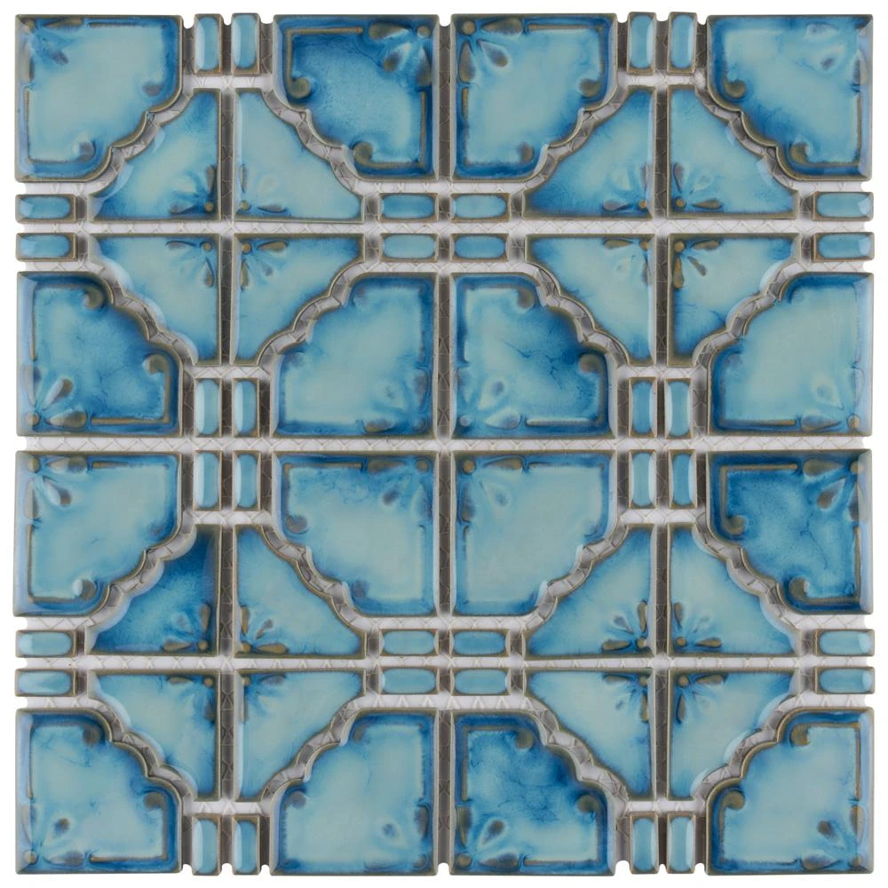 The Merola Tile Moonbeam Diva Blue 12 in. x 12 in. Porcelain Mosaic Tile features a unique mosaic composition as well as a beautiful multi-tonal glaze. With a glossy finish in multiple tones of blue, this tile is suitable for any wall or backsplash installation, or light-traffic residential floors. Use it in its natural format as a field tile, or cut it into strips or square decor pieces to accent other tiles.