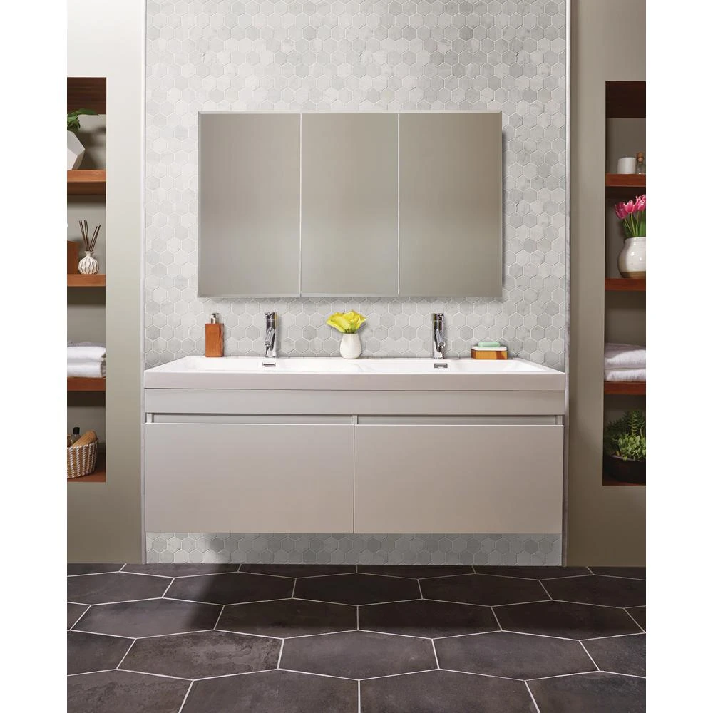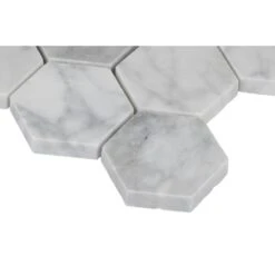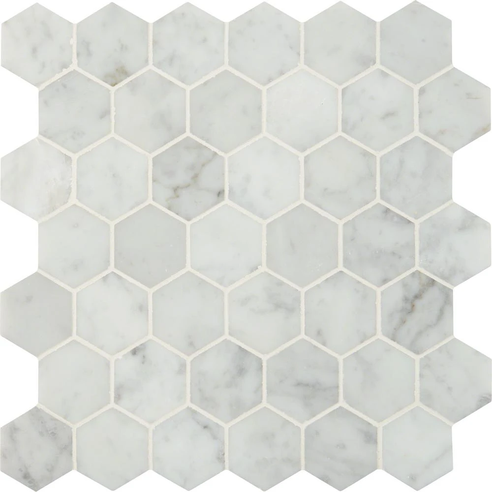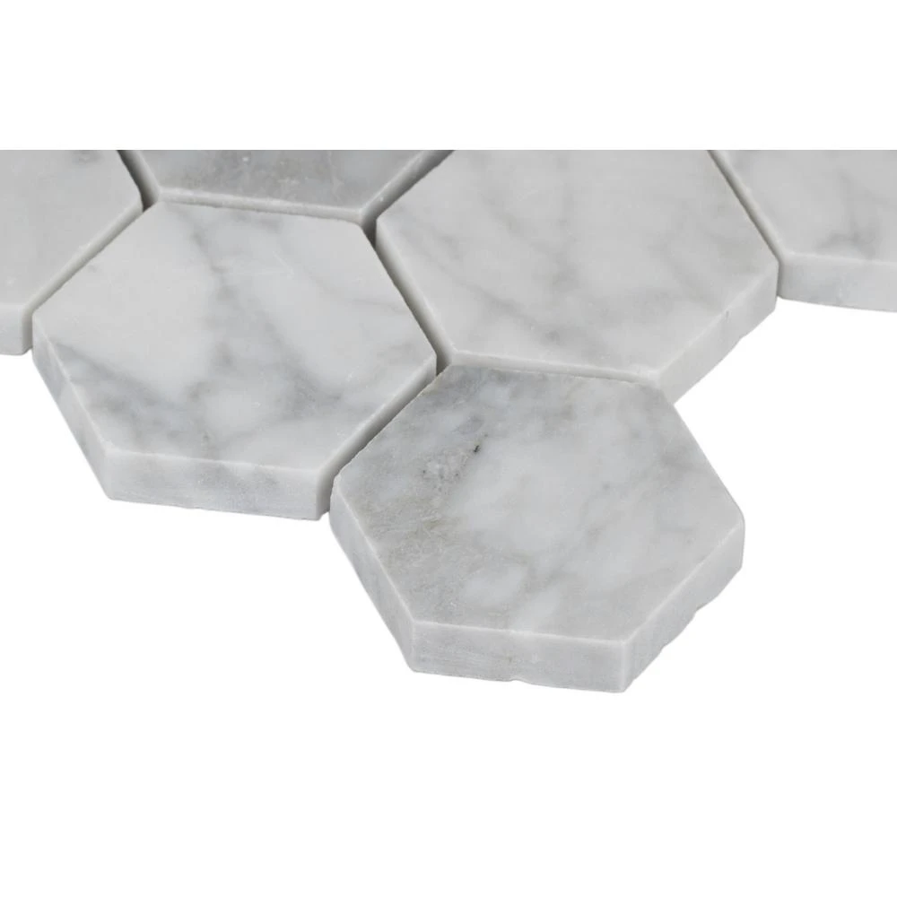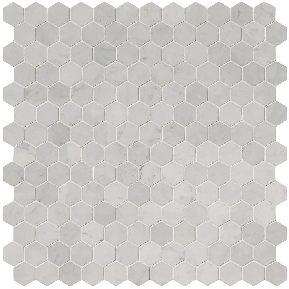 Add a splash of distinction to your decor with this 12 in. x 12 in. x 10 mm. polished marble mesh-mounted mosaic floor and wall tile. This Grade 1 tile lends a unique pattern to your floors, walls and countertops. The luxurious hexagonal-pieces are sized on a mesh sheet for easy installation. This flooring option is designed with a smooth, polished finish. Offering supreme style and strength, the impervious, frost-resistant tile absorbs less than 0.5 percent of water. Natural stone products inherently vary in color, shade and finish and should be installed and sealed with a penetrating sealer. Included per case are 10-pieces.