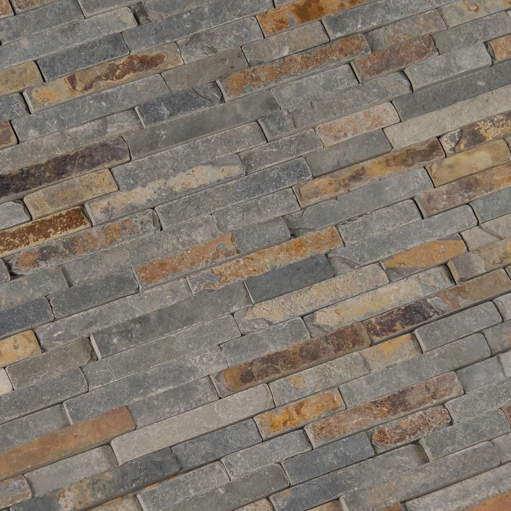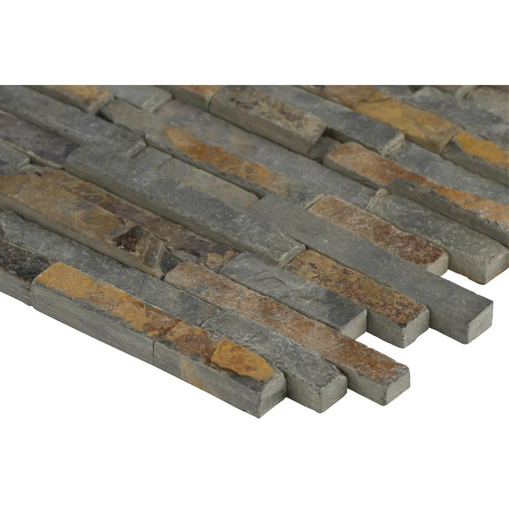Add a splash of sophistication to your decor with this 8 in. x 18 in. x 10 mm. slate mesh-mounted mosaic floor and wall tile. This Grade 1 tile lends urban flair to your residential or commercial expanse. The attractive tile pieces are sized on a mesh sheet for easy installation. This flooring option features multi-color shades of tumbled natural slate. Natural stone products inherently vary in color, shade and finish and should be secured with a penetrating sealer. Offering supreme style and strength, the vitreous tile absorbs less 3% but more than 0.5% water. Included per case are 10 pieces. Note: Inspect all tiles before installation. Natural stone products inherently lack uniformity and are subject to variation in color, shade, finish etc. It is recommended to blend tiles from different boxes when installing. Natural stones may be characterized by dry seams and pits that are often filled. The filling can work its way out and it may be necessary to refill these voids as part of a normal maintenance procedure. All natural stone products should be sealed with a penetrating sealer.