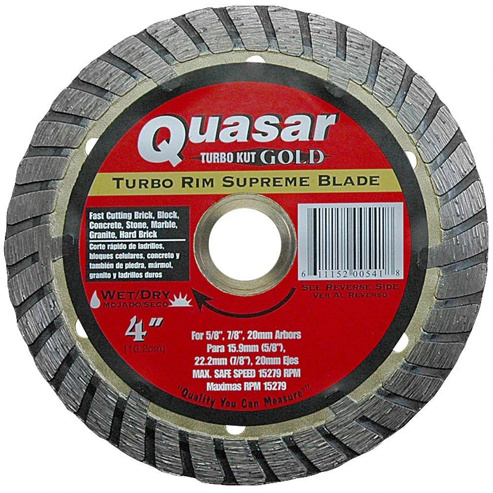 This Quasar Turbo Kut Gold 4 in. Turbo Rim Supreme Blade is for use with a right-angle grinder and fits 5/8 in., 7/8 in. and 20 mm arbors. It is for fast cutting of brick, block and concrete. It can also be used to cut stone, marble, granite and hard brick. This blade has a maximum safe speed of 15,279 RPM and can be used wet or dry.
